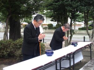 木賊町長が 「戦後八十年が過ぎた。 戦時中、 祖国や家族を思い尊い命を亡くされた御霊に哀悼を捧げたい」 と述べ、 正午のサイレンと同時に参加者全員が黙とうを捧げ、 木賊町長をはじめ参列者が焼香し百九十余柱の英霊を追悼した。