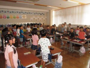 始業式は熱中症防止などのため校内放送で行われ、 柿沼孝明校長が 「夏休み中は家の手伝いや習い事などを頑張ったと思うが、 今日から二学期、 友達と仲良く、 褒められたことを伸ばすなど、 上のステージを目指してほしい」 とあいさつ。 校歌斉唱で閉式した。(二学期始業式)
