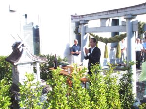 丸山組合長、 小松浩代表理事専務らが玉串を捧げ米集荷作業の安全を祈願した。