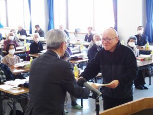 会員約百人が参加、 大野会長が 「健康長寿を目指し各種事業としてスポーツをはじめ社会奉仕活動では孤立した高齢者へ友愛訪問などを行っている。 今年も会員増強に協力を」 とあいさつした。