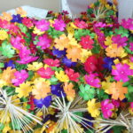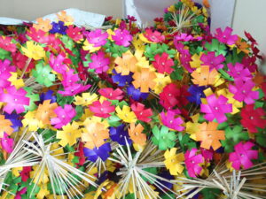赤、 ピンク、 黄、 緑、 オレンジ、 紫で色が濃く鮮やかに染められた花びら六枚は、 きれいに分れ、 動かないように丁寧に仕上がっている。 古くからの製作法で竹や松などの自然素材を使用し長持ちするよう頑丈にできている外、 地面にささりやすいよう斜めに竹の下部をカットするなど工夫されている。