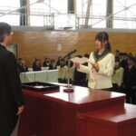 新入生徒百八十四人が出席、 亀田光弘校長が 「入学おめでとう、 未来の予測は難しい時代だが、 高い価値観、 校訓である英知を持って、 決意を新たに夢幻の可能性を広げ、 充実した三年間を送り人間として大きく成長してほしい」 と式辞を述べた。 続いて室井淳PTA会長らが祝辞を述べ、 新入生を代表して折笠釉娃さんが 「感謝を忘れず、 仲間と励み、 絆を深めて自身を高めるため日々励む」 と誓いのことばを述べて閉式した。